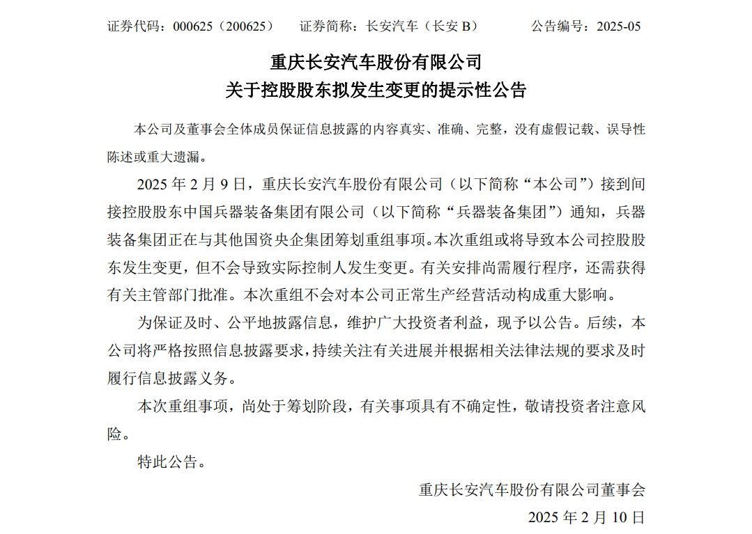 长安汽车发布的公告称,2025年2月9日,重庆长安汽车股份有限公司接到间接控股股东中国兵器装备集团有限公司(简称兵装集团)通知,兵装集团正在与其他国资央企集团筹划重组事项。